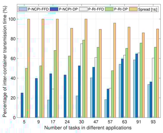 Finally, the results of the communication overhead for various task-containerization-and-container-placement algorithms are shown in Figure 8. We can see that when compared with the benchmarking Spread algorithm, the P-NCPI-FFD algorithm saves 74.10% of the communication overhead, while the P-RI-FFD algorithm saves 59.32%. The communication overhead of FFD is lower than that of DP, because it does not have to consider the balance between the resource demand of containers and the resource supply of servers.