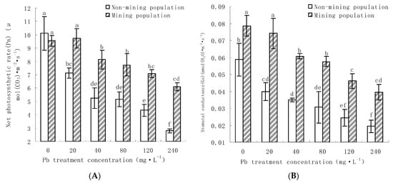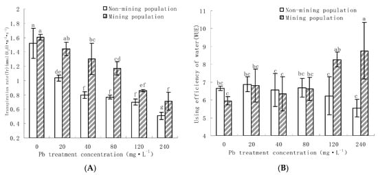 The value of water use efficiency (WUE) is directly determined by the transpiration rate and net photosynthetic rate [39]. As can be seen from Figure 3B, there was no significant difference in water use efficiency between non-mining population and mining population under control and low concentration Pb (20 mg·L−1 and 40 mg·L−1) treatment (p > 0.05), while high concentration Pb (120 mg·L−1 and 240 mg·L−1) treatment, the population in mining area was significantly higher than that in non-mining area (p < 0.05). There were also different trends in the variation of the population in mining and non-mining areas. The water use efficiency of non-mining area population increased at low concentration treatment, but decreased sharply with the increase in treatment concentration, and it reached the lowest at 240 mg·L−1 treatment. The population water use efficiency increased with the increase in treatment level, and reached the highest level at 240 mg·L−1, which was significantly different from that of the control (p < 0.05), and was 148.8% of that of the control.