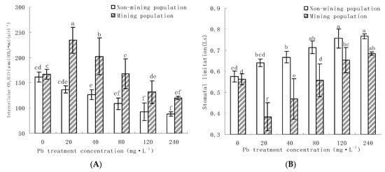 Stomatal limitations (Ls) were varied by intercellular CO2 and atmospheric CO2 concentration. The stomatal limit of the non-mining population increased significantly with the increase in Pb concentration (Figure 3B), while the mining population decreased at low concentration stress and increased significantly at extreme concentration (120 mg·L−1 and 240 mg·L−1). Clearly, under Pb stress, the intracellular limit value of the non-mining population was significantly larger than that of the mining population. The analysis of variance showed that there was a significant difference between Ls and control under high Pb stress (p < 0.05).