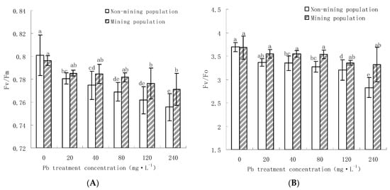 Effects of different treatments on the PSII maximal photochemical efficiency Fv/Fm and the ratio of variable fluorescence to initial fluorescence Fv/F0 of two Miscanthus floridulus populations under different Pb treatment ((A) is Fv/Fm, (B) is Fv/F0). Note: Error bars indicate standard deviation; Different letters in the same group indicate significant difference at p < 0.05 according to Duncan’s multiple range tests; the same below.