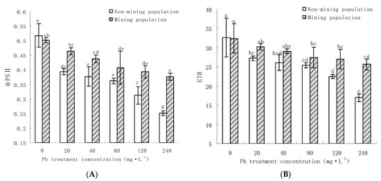 The PSII actual photochemical efficiency (ΦPSⅡ) and the acyclic electron transfer rate (ETR) of two Miscanthus floridulus populations under different Pb treatment ((A) is ΦPSⅡ, (B) is ETR). Note: Error bars indicate standard deviation; Different letters in the same group indicate significant difference at p < 0.05 according to Duncan’s multiple range tests; the same below.