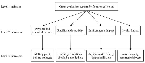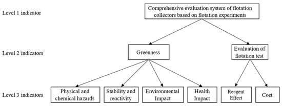 There are standards for flotation effect, carcinogenicity, acute toxicity, reproductive toxicity, and flash point of the flotation collector in the industry, but the evaluation is scattered and cannot evaluate the flotation collector systematically and comprehensively [20,21,22,23]. The green-comprehensive evaluation system can consider a flotation process as a whole and, through the decomposition of the overall flotation process, get various impacts of flotation collectors in manufacturing, transportation, storage, and use, then specifically analyze the connection between individual flotation and the whole, then make a scientific and reasonable evaluation of flotation collectors.