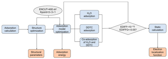 The adsorption process on the mineral phase surface was simulated and calculated in the DFT software VASP (Figure 2). Generalized gradient approximation, where the approximate method of exchanging correlation functions reflected the accuracy of the calculation, was used for the exchange correlation generalization. The pseudopotential was Perdew–Burke–Ernzerh (PBE), a virtual potential introduced in the numerical calculation of the energy band structure. The surface was optimized by the conjugate gradient method with a plane wave truncation energy of 400 eV. The Monkhorst–Pack method was used to generate a 3 × 3 × 1 K-point grid. The energy convergence threshold for the self-consistent field iteration of the surface optimization was 10−5 eV. The geometry optimization criterion was less than 0.05 eV/Å per atom around the force (details in Table S1).