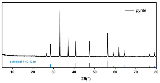 The composition of the pyrite sample was analyzed by ICP, and the results are recorded in Table 2. The phase of the pyrite was analyzed by XRD, and the results are shown in Figure 4. The ICP results indicated that the pyrite samples used in the experiment contained Fe and S. The sum of the two elements amounted to 98.72%. The XRD results indicated the pyrite samples to be pure.