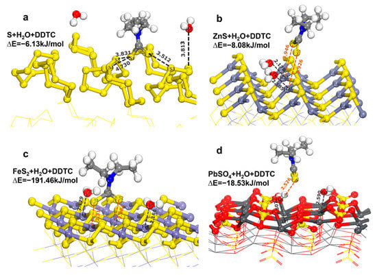 H2O had different degrees of influence on the adsorption of DDTC on different carriers (Figure 7). For instance, on sulfur, H2O had little influence on the adsorption structure and energy of DDTC (decreasing from −6.65 to −6.13 kJ/mol). On sphalerite, the adsorption energy of DDTC was significantly weakened from −42.57 to −8.08 kJ/mol, and its adsorption mode transformed from chemisorption to physical adsorption (Figure 7b). This was due to the adsorption of H2O around the zinc atoms of sphalerite. On pyrite, the adsorption energy of DDTC changed slightly from −195.64 to −191.46 kJ/mol with consistent chemisorption (Figure 7c). This indicated the little impact of H2O. On the surface of lead sulfate, H2O was preferentially adsorbed. DDTC was adsorbed on the surface of lead sulfate by electrostatic interaction with H2O, which is a kind of indirect adsorption (Figure 7d). The adsorption energy of DDTC significantly weakened from −81.05 to −18.53 kJ/mol.