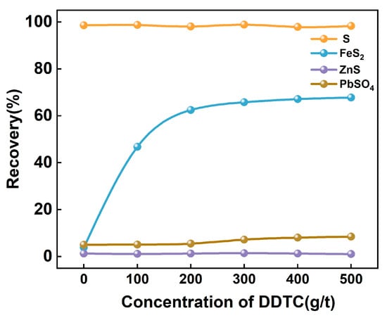 Pure mineral flotation was performed to validate the coadsorption model (Figure 8). In the absence of DDTC, sulfur had almost 100% recovery, indicating excellent flotation performance, while sphalerite, pyrite, and lead sulfate had low recoveries, indicating that these minerals had good hydrophilic properties. With increasing DDTC concentration from 0 to 500 g/t, the recovery of sulfur, sphalerite, and lead sulfate saw little change, while the recovery of pyrite increased significantly. After the addition of DDTC, the recovery of pyrite increased by nearly 60% compared to that without DDTC. This indicated that DDTC had weak ability to trap sulfur, sphalerite, and lead sulfate but had the desired ability to trap pyrite. This result was consistent with the result of the coadsorption model: the interaction of DDTC on sulfur, sphalerite, and lead sulfate was weak adsorption, while the interaction of DDTC on pyrite was strong adsorption.