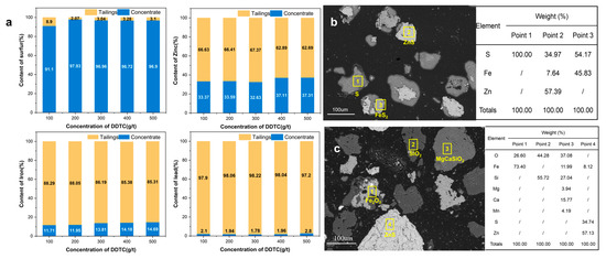 Element distribution behavior at different DDTC concentrations. (a) Element distribution; (b) mineral deposit pattern in the concentrate; (c) mineral fugacity pattern in the tailings.
