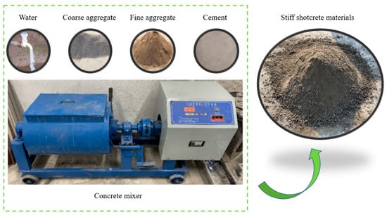 The material of stiff shotcrete is composed of cement, fine aggregate, coarse aggregate, and tap water, and the mix proportions are: cement, fine aggregate, and coarse aggregate = 1:2.25:1.5. River sand is used as the fine aggregate. The moisture content does not exceed 6%. The coarse aggregate is a washed, crushed-stone pebble block. Before mixing, the coarse aggregate is screened with a sieve mesh so the maximum size does not exceed 10 mm. The stiff shotcrete materials are premixed for 5 min through the mixer to ensure uniform distribution of materials. The mixing process is shown in Figure 1. All the above materials comply with GB 50086-2015 [41].