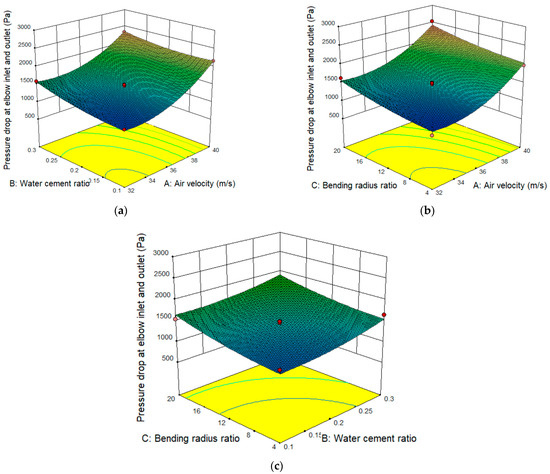 To summarize, the degree of influence for each factor on the elbow pressure drop is air velocity > bending-diameter ratio > water-cement ratio. In addition, there is a significant interaction between the air velocity and bending-diameter ratio, air velocity, and water-cement ratio. At the same time, there is no significant interaction between the bending-diameter ratio and the water-cement ratio.