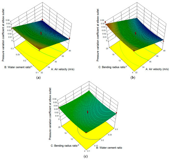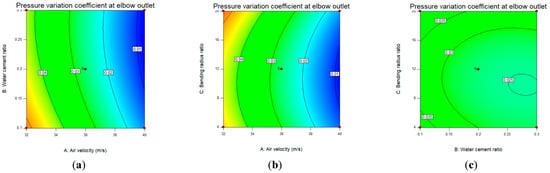 It can be seen from Figure 3 and Figure 4a that the contour line distribution of the abscissa is denser than that of the ordinate, which indicates that the air velocity has a more significant effect on the elbow pressure drop than the water-cement ratio. The response surface is distorted, meaning the interaction between the two is substantial. It can be seen from the trend of the three-dimensional curved surface that when the water-cement ratio is a particular value, the pressure drop at the inlet and outlet of the elbow increases with the increase in air velocity.
