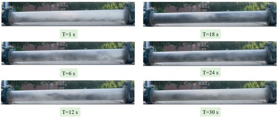 Figure 8 shows the snapshots of pneumatic conveying at different times when the air velocity is 40 m/s, the water-cement ratio is 0.2, and the bending-diameter ratio is 4. As shown in Figure 8, when stiff shotcrete particles pass through the outlet of the elbow, a small amount of sprayed concrete particles pass through the bottom of the pipe. Subsequently, due to the influence of air velocity and secondary flow, the stiff shotcrete particles form a stable suspended flow, which continues until the material particles are transported.