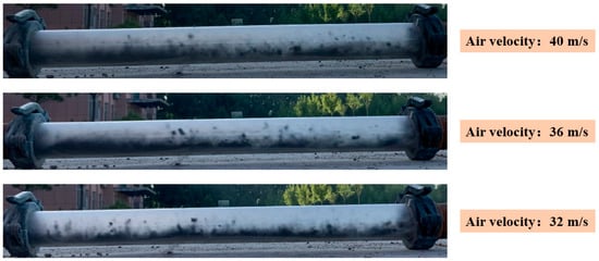 In Figure 9, a snapshot of the pneumatic transport of stiff shotcrete after bending is obtained under the conditions of a water-cement ratio of 0.3, a bending-diameter ratio of 4, and an air velocity of 40 m/s, 36 m/s, and 32 m/s, respectively. As shown in Figure 9, under different air velocities, the stiff shotcrete particles of wet shotcrete can reach a stable conveying process after passing through the bending stage. In addition, when the air velocity decreases, the flow pattern of the material particles of the stiff shotcrete gradually transits from suspension to bottom flow.
