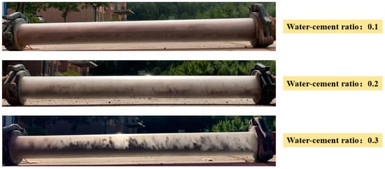 Figure 11 shows the snapshot of the pneumatic conveying of stiff shotcrete material particles at different water-cement ratios under the conditions of 36 m/s air velocity and a bending-diameter ratio of 4. As shown in Figure 11, the material particle group keeps the bottom flow stable at this air velocity. It should be noted that when the water-cement ratio of the stiff shotcrete material is 0.1, a small amount of cement does not undergo a hydration reaction and is still transported pneumatically in powder form. As a result, cement accumulations of varying degrees occur at the bottom of the pipeline and slip forward at a shallow velocity relative to the suspended materials.