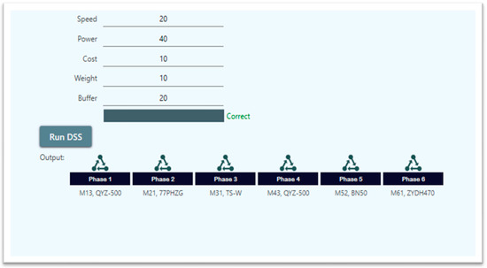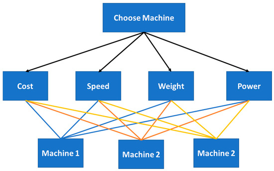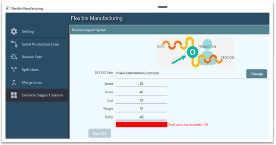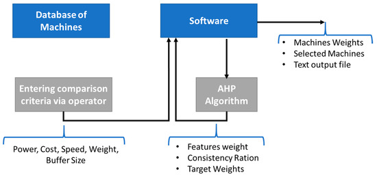 The selection method for the choice of a machine in a production line is both very challenging and very complex due to the many features that must be considered for each machine and the large number of different machines that comprise the required production environment. The software has been developed to optimize the selection between machine tools according to the specifications input by the operator based on AHP, one of the highly effective algorithms in the Decision Support System (DSS), see Figure 5. The software was developed using Python programming language. The authors utilized AHB because it is easy to consider the priorities of factors and it provides a very flexible model architecture for the desired problem. AHB enables the operator to set the criteria weights of every tool in the production line; in addition, AHP offers a very simple and flexible approach [31]. The flexible model helps the operator to update the system according to the constraint changes. However, AHP is a subjective method but it is not a limitation in this paper because the AHP is utilized as a decision support system that will be guided by the operator. The identification of values is very important for the AHP algorithm because it refers to the criteria of selection. In the literature, some studies utilized multi-objective optimization to perform the decision support system, such as a fuzzy multiple-attribute decision-making model, integer programming models, and genetic algorithms (GA). All of these studies were effective but with a limitation on how to be implanted in comparison with the AHP [31].