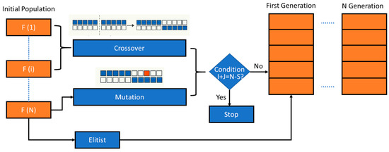In this research, GA is utilized to obtain the optimal or near-optimal buffer size. GA is one of the well-known meta-heuristic optimization methods, which finds the optimal or near-optimal solution based on natural selection and genetics principles. GA begins with an initial population, including arbitrarily selected solutions known as individuals. After determining the fitness of all individuals in the initial population, the next population can be generated by applying GA operations. These procedures are reiterated to achieve the optimal solution of the problem. The results of the highest fitness will take the role of the candidate solution to the processing problem. It is important to identify the structure of an individual and encode the individual’s elements. In this research, the individual is defined as a vector with n − 1 elements, where n is the number of machine tools in an SPL. Each of these elements denotes one buffer. The GA optimization procedure is illustrated in Figure 8 and further theoretical explanation can be found in [28].