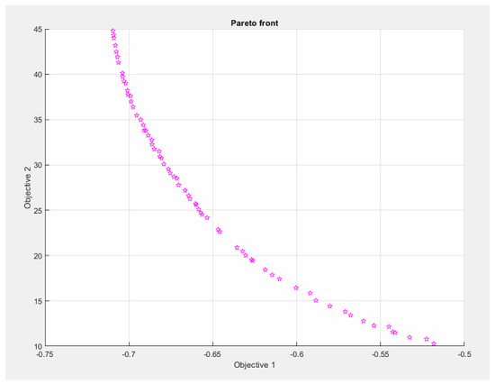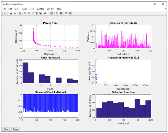 After pressing the “start optimization” button, the MATLAB runtime loads, and the GA solver shows the results on the screen in real-time, see Figure 14.