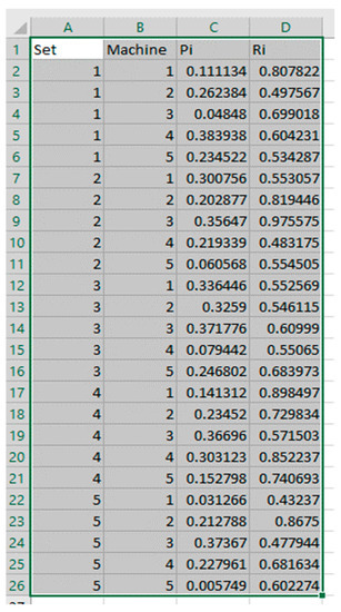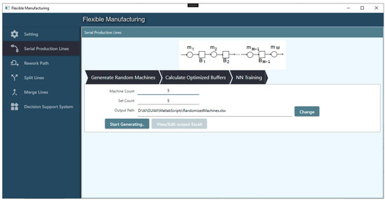 The software can be easily adapted to different types of production lines, such as those not currently covered. As our first example, we will demonstrate working with an SPL; first, we generate a random machine set from the first page of the application and input the Machine count and set count. Then we press “Start Generating”, and the software saves the data in an Excel format to be available for the user to manually edit if necessary. After generating the file, the interface will enable the button to open the file for editing; the results are shown in Figure 12.