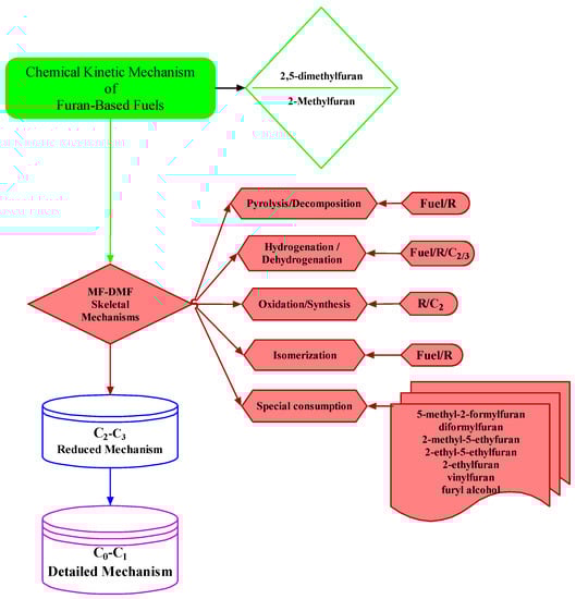 There are many corresponding bio-derived fuels [10], and the current common ones include 5-hydroxymethylfurfural (HMF) [11], 2-Methylfuran (MF) [12], and 2,5-dimethylfuran (DMF) [13,14]. The collaborators for this study are the ones who prepare furfuryl alcohol mainly from furfural [15], and furfuryl alcohol is further synthesized into the high-value-added products MF and DMF using copper–silicon-based catalysts [16]. As shown in Figure 1, the synthesis process is a pre-process study between the group and the partner, which is not reflected in this paper. However, the application of such a method of fuel preparation falls under the category of carbon sink [17]. Therefore, this study intends to construct a skeletal chemical reaction mechanism for binary alternative fuels derived from the platform molecule furfural, which consists of MF and DMF, in order to study their combustion characteristics. Thus, the whole research project was completed in a closed loop.