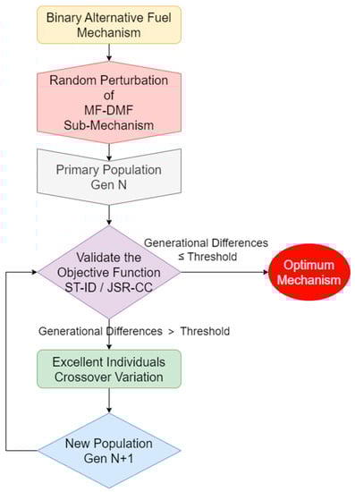 In this subsection, the initial mechanism of the binary alternative fuel is optimized by the non-inferiority solution ranking genetic algorithm program (NSGA-II), which is commonly used by the group [22]. The core of optimization lies in the rational adjustment of the reaction rate coefficient of the MF-DMF sub-mechanism.
