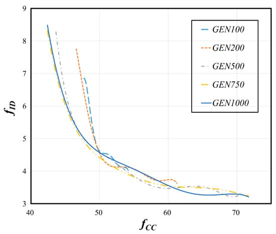 The optimization process of this algorithm is expressed in Equations (1)–(3) for the fitting functions of the ID in ST and the CC in JSR, respectively. Additionally, the optimized iterative evolution process is represented by a Pareto front [24] diagram as shown in Figure 5.