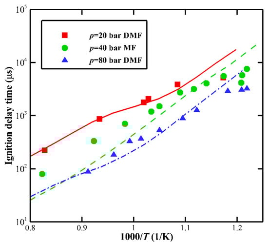 Due to the lack of experimental results for this alternative fuel, the present verification compares the experimental results of ignition delay, which was measured in a ST by Uygun et al. for MF [12] and Somers et al. for DMF [20]. As shown in Figure 6, the optimized mechanism of the binary alternative fuel has a good prediction accuracy for the ID of MF and DMF in ST at stoichiometric, temperature intervals of 800–1250 K, with pressure taken as 20, 40, and 80 bar. The experimental uncertainties are all 20%. The advantages of this mechanism for the ID prediction of DMF are obvious. Additionally, for MF, the ID prediction is better in the low-temperature region. However, there are some deviations in the prediction of the ID for MF under high temperatures and for DMF in the low-pressure and low-temperature regions.