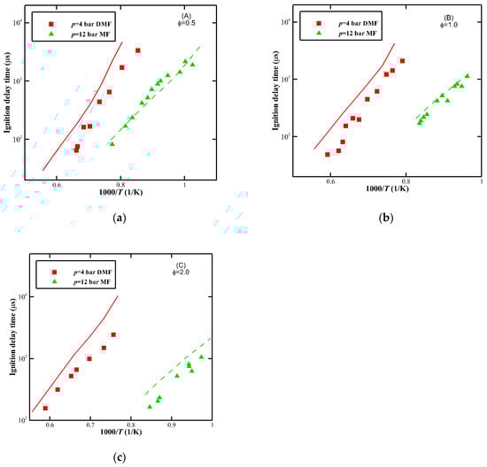 Experimental and predicted results of ID obtained for alternative fuel/oxygen mixtures in a ST at φ = 0.5–2.0 and p = 4 and 12 bar, respectively. (a): φ = 0.5; (b): φ = 1.0; (c): φ = 2.0. The dots are the experimental results [28,29] and the lines are the predicted results.