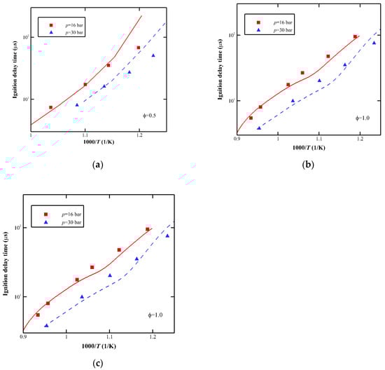 Experimental and predicted results of ID obtained for alternative fuel/oxygen mixtures in a RCM at φ = 0.5–2.0 and p = 16 and 30 bar, respectively. (a): φ = 0.5; (b): φ = 1.0; (c): φ = 2.0. The dots are the experimental results [33] and the lines are the predicted results.