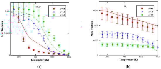 Figure 9 shows the results of the analysis of several major component concentrations of DMF/air mixtures predicted by the optimization mechanism in JSR compared with experimental data, including two reactants, two products, and two major intermediates, with working conditions of φ = 0.5–2.0, p = 10 bar and T = 700–1250 K. As can be seen from Figure 9, the mechanism predicts component concentrations lower than the experimental values at low equivalence ratios and partially higher concentrations at high equivalence ratios, while the prediction accuracy is excellent upon the performance of stoichiometry. When predicting oxygen consumption, this mechanism predicts better under medium to high equivalence ratios, while the prediction is high under low equivalence ratios. This mechanism is able to predict both H2O and CO2 well at low to medium temperatures, with minor deviations at high temperatures. As far as the prediction results of two intermediates, CO and CH2O, selected in this study, the mechanism is able to predict accurately except for a slightly higher prediction of CH2O at low equivalence ratios and low temperatures. Considering the small order of magnitude of the component concentrations and the uncertainty of the experimental data [20], this mechanism is basically able to predict the component concentrations reliably.