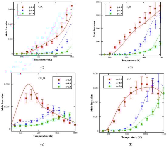 Experimental and predicted results of CC obtained for alternative fuel/air mixtures in a JSR at φ = 0.5–2.0 and p = 10 bar. (a): DMF; (b): O2; (c): CO2; (d): H2O; (e): CH2O; (f): CO. The dots are the experimental results [20] and the lines are the predicted results.