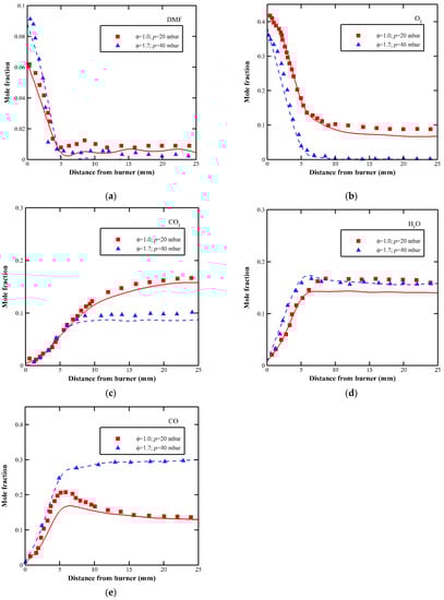 Experimental and predicted results of CC obtained for alternative fuel/oxygen mixtures in a premixed laminar burner at φ = 1.0 and 1.7, p = 20 and 40 mbar. (a): DMF; (b): O2; (c): CO2; (d): H2O; (e): CO. The dots are the experimental results [34] and the lines are the predicted results.