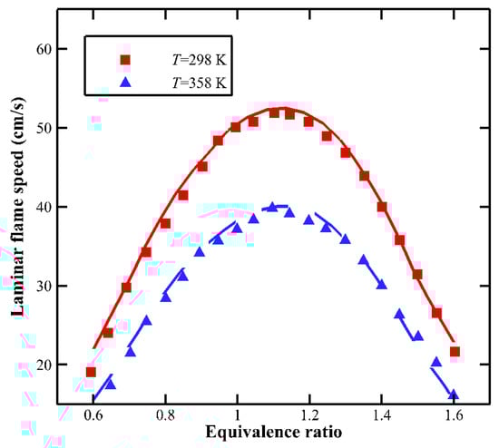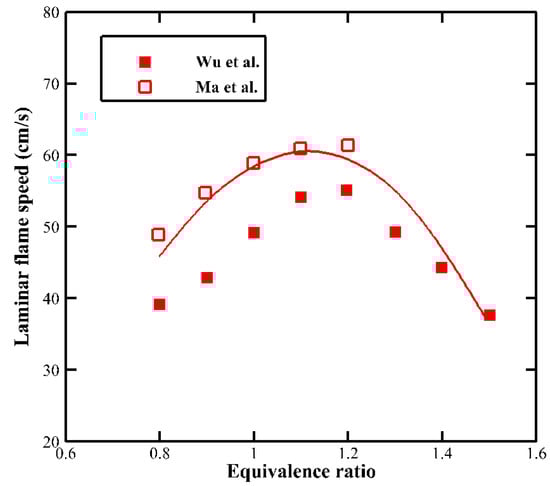 As shown in Figure 12, the present study constructs mechanisms that describe well the experimental results of Ma et al. [35] but deviate considerably from the results of Wu et al. [36] for the same conditions due to the differences of the experimental technique leading to some differences in experimental data under the same operating conditions. This measurement uncertainty can make it difficult for the mechanism to fit the laminar flame speed for each fuel well [37].
