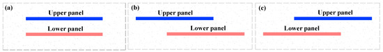 Supposing the width of the upper panel and the lower panel are equal, according to the relative location of the panels in two seams, the mining panel layout configuration with equal width can be divided into stacked, external staggered, and internal staggered. A detailed description can be expressed as follows: (1) Stacked, the edges of the upper panel and the lower panel are vertically aligned (Figure 1a); (2) External staggered, the edges of the upper panel and the lower panel are not aligned, and the upper panel is staggered outside the lower panel with a certain width (Figure 1b); (3) Internal staggered, the edges of the upper panel and the lower panel are also not aligned, and the upper panel is staggered inside the lower panel with a certain width (Figure 1c).