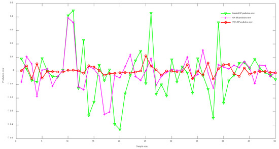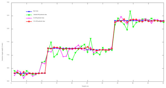 Figure 9 shows the comparison of the error between the aeration oxygen supply and the actual value of the three algorithms of the standard BP neural network algorithm, the GA-BP neural network and the CGA-BP neural network. From