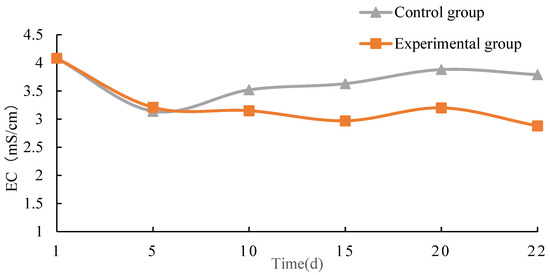 Figure 13. The EC values of the two groups do not change much. During each stage of composting fermentation, the metabolic rate of micro-organisms increases, and the decomposition of organic matter generates a large amount of mineral salts, which increases the EC value. As ammonia volatilizes, the EC value also decreases. The experimental group can fully react in the early stage of composting, and then continue stable fermentation, effectively promoting maturity.