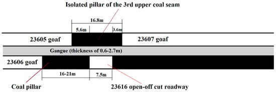 The 23616 open-off cut roadway was originally designed to be located under the third upper coal goaf. The overlying rock was supported by a 12# I-steel shed. As the roof collapsed after the mining of the upper layer, and the distance between the lower layer and the goaf was relatively close, the cracks were connected, which might bring hidden dangers of air leakage and ignition. Therefore, the 23616 open-off cut roadway was arranged below the upper coal pillar, with a width of 16.8 m. The south was the 23607 goaf, the north was the 23605 goaf, and the west was the 23606 goaf. The distance between the 23616 coal face and the upper goaf was 0.6–2.7 m, with an average of 1.40 m. The width of the open-off cut roadway was 7.5 m, and the width of the left coal pillar was 16–21 m. Therefore, the 23616 open-off cut roadway was affected by the roof abutment pressure of the multiple goafs at the same time. In order to install the hydraulic support and scraper conveyor, the width of the 23616 open-off cut roadway must not be less than 7 m. Therefore, the support method of large-span open-off cut roadways in multistress concentration areas needs to be further investigated.