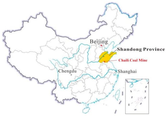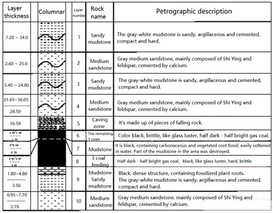 As shown in Figure 2, Chaili Coal Mine is located in Zaozhuang City, Shandong Province, China. The ground level is +35.81~+36.78 m. The level of the third coal seam is −333.5~−382.0 m. The third coal seam is divided into the upper layer and the lower layer due to a dirt band. The thickness of the third lower coal seam is 2.60~4.60 m, with an average of 3.90 m. Figure 3 is a comprehensive histogram of the roof and floor of the third coal seam. The basic roof is medium sandstone, with a thickness of 21.65~36.05 m and an average of 28.50 m. The direct floor is mudstone and sandy mudstone, with a thickness of 1.80~4.80 m and an average of 3.56 m. The basic floor is medium sandstone, with a thickness of 0.95~7.70 m and an average of 2.76 m.