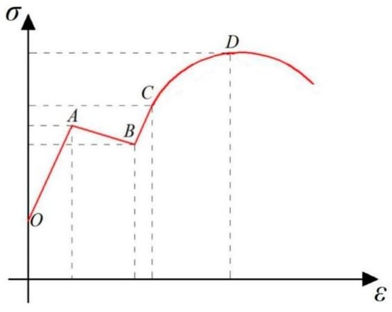 On the basis of high prestress, a yielding bolt can release the elastic energy of a roadway after excavation. The deformation resistance of the bolt was enhanced to reduce the breaking of the rod caused by the rapid increase of stress so as to ensure early effectiveness. The stress–deformation characteristics of the prestressed yielding bolt are shown in Figure 4 [25]. Stages A–B represent the deformation of the yielding structure.