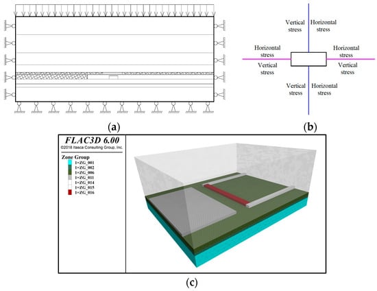 Numerical simulation and boundary conditions. (a) Boundary conditions of numerical model; (b) applying stress; (c) three-dimensional numerical model.