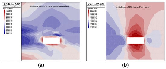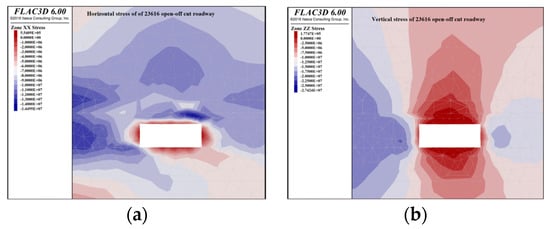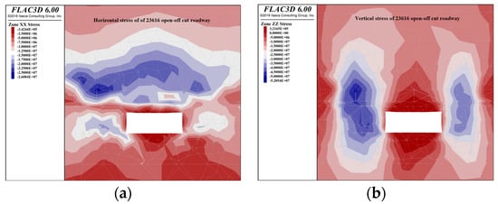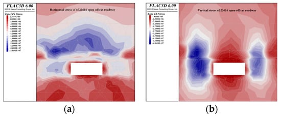 Stress diagram of 23616 open-off cut roadway after support under the nonmining conditions of the upper coal seam. (a) Horizontal stress; (b) vertical stress.