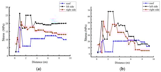 The distance in Figure 9 refers to the distance between the surrounding rock and the roadway surface. As the distance increased, the depth of the surrounding rock increased. As shown in Figure 9a, under the nonmining conditions of the upper coal seam, the vertical stress of the left side was about 20~25 MPa, with a peak value of 26 MPa. The vertical stress on the right side was about 13~17.5 MPa, with a peak value of 21 MPa. The horizontal stress of the roof was about 6~12 MPa, with a peak value of 17.5 MPa. In the mining process of the 23606 coal face, the third upper coal seam was seriously damaged due to the bending and collapse of the third lower coal seam roof. The 23616 open-off cut roadway was affected by the advanced abutment pressure of the 23606 coal face.