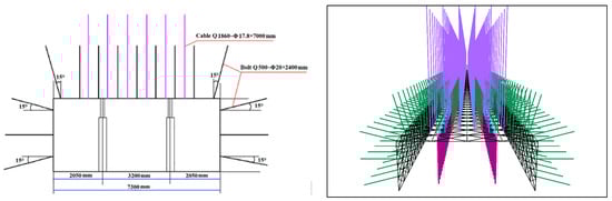 The width and height of the 23616 open-off cut roadway were 7300 mm and 2800 mm. The diameter and length of the bolt were 20 mm and 2400 mm. The spacing–discharge distances on the roof and the sides were 850 × 1000 mm and 1000 × 1000 mm. The diameter and length of the cable were 17.8 mm and 7000 mm. The spacing–discharge distances were 850 × 1000 mm. Each discharge of six cables was arranged. Each bolt and cable were matched with a yielding pipe. Each discharge of two single hydraulic props was arranged. The spacing–discharge distance was 3200 × 500 mm. The support unit of the 23616 open-off cut roadway is shown in Figure 10.