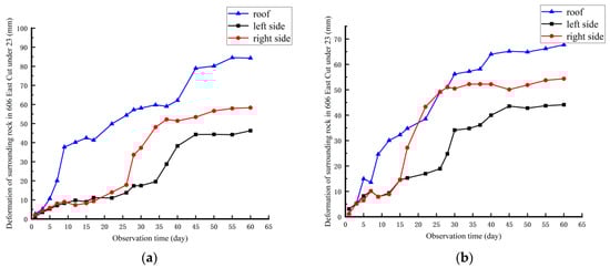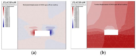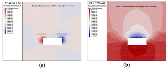Displacement diagram of 23616 open-off cut roadway after support under the mining conditions of the upper coal seam. (a) Horizontal displacement; (b) vertical displacement.