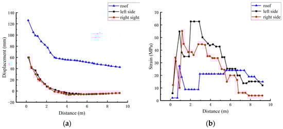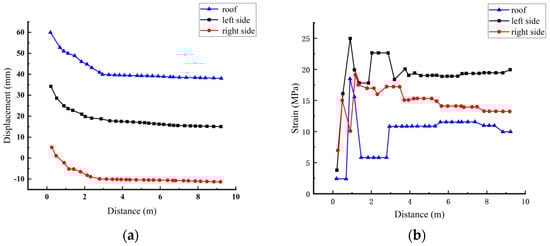 Monitoring data of 23616 open-off cut roadway after support under the mining conditions of the upper coal seam. (a) Displacement; (b) stress.