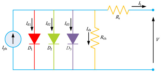 where is the reverse saturation current of diode D1, is the reverse saturation current of diode D2, is the reverse saturation current of diode D3, a1 is the quality factor of diode D1, a2 is the quality factor of diode D2, and a3 is the quality factor of diode D3, respectively.
