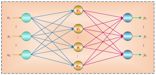 RBF neural network is a classic model of artificial neural networks belonging to feedforward neural networks. It has good generalization ability and fast convergence speed and can approximate any function with high accuracy. It is commonly used to fit nonlinear maps [25]. It utilizes strict interpolation methods in multidimensional space to provide a set of functions for hidden units, which construct an arbitrary basis for the input vector when it is extended to the hidden space. The functions in this set are the base functions. RBF is composed of an input layer, a hidden layer, and an output layer. The input layer is composed of signal source nodes, connecting the external environment and network. The transformation function of the hidden layer is the RBF, which is used as the nonlinear transformation from the input vector space to the hidden layers [26,27]. The output layer linearly combines the hidden layers to output certain vector target features. The schematic diagram of RBF is shown in Figure 4.