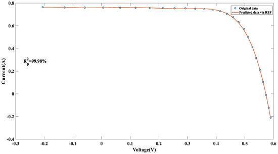 Identifying PV cell parameters essentially involves fitting I-V data, and the final identification accuracy depends heavily on voltage and current data. However, it is difficult to obtain actual cell voltage and current data. Therefore, this article uses RBF to train existing I-V data and then perform data prediction to expand the data volume. The results of prediction through RBF are shown in Figure 6. It can also be seen that the data predicted by RBF also has extremely high fitting accuracy with the original data and the fitting correlation coefficient is 99.98%.