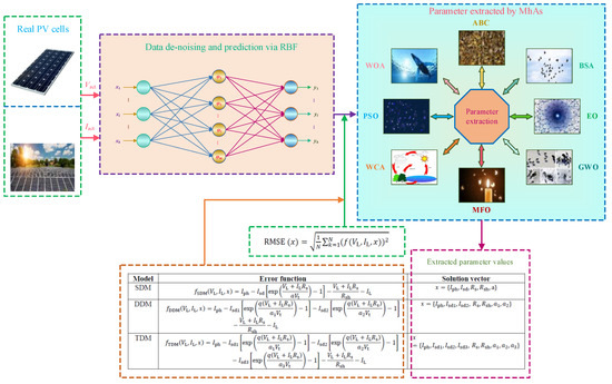 At present, research on PV cell identification mainly uses heuristic algorithms for parameter identification, but there is less processing and research on measured data. This paper proposes meta-heuristic algorithms (MhAs) for PV cell parameter identification based on RBF, which de-noises, trains, and predicts through RBF data [22] and then uses MhAs for parameter identification processing [23]. The final results also fully demonstrate that the extraction accuracy after data de-noising and prediction is higher than that of the original data. This article opens up a new direction for the identification of PV cell parameters, starting from fitting data and studying the impact of measured I-V data on the identification effect, providing new ideas for the research of PV cell parameter identification. The contributions and innovations of this article can be summarized as follows.