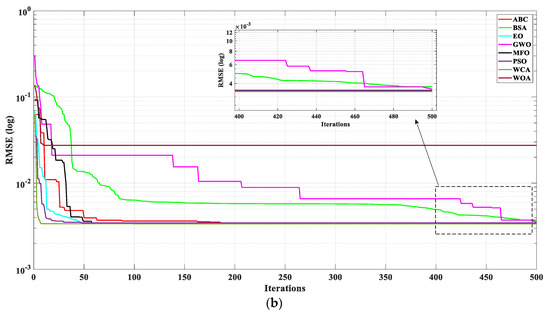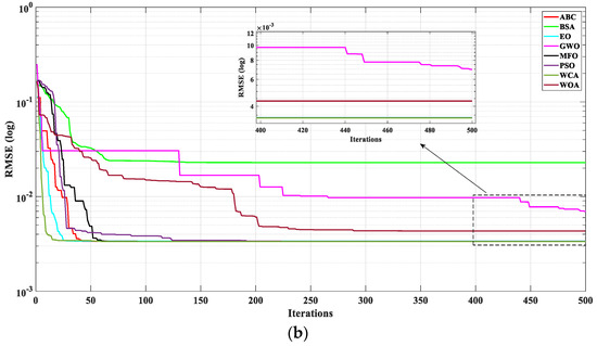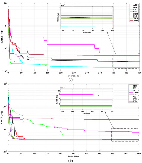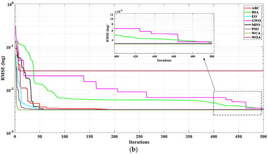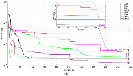 Figure 18 shows the RMSE iteration curves of the eight algorithms under the conditions of noised and de-noised data. It can be seen that the RMSE obtained by the eight algorithms has decreased.