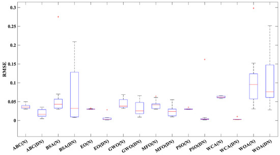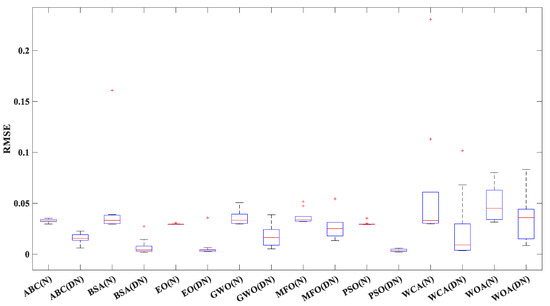 Figure 14 shows the RMSE distribution boxplot obtained by DDM under two data conditions. It can be seen that after data de-noising, the upper and lower bounds of the RMSE distribution of other algorithms except for WOA have decreased, and the median has also decreased to a certain extent.