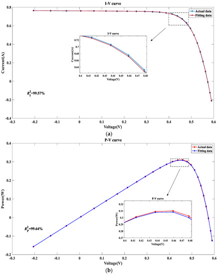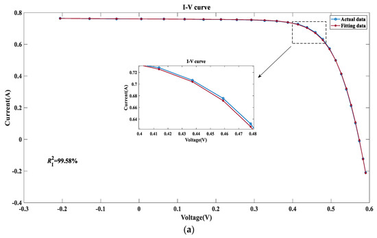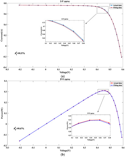 Figure 15 shows the I-V curve and P-V curve obtained by DDM using the WCA algorithm under de-noised data conditions. WCA obtained the lowest RMSE and highest accuracy under de-noised data conditions. It can be seen from the figure that the fitting accuracy is very high. The correlation coefficient of I-V curve fitting is 99.57%, and the correlation coefficient of P-V curve fitting is 99.64%.